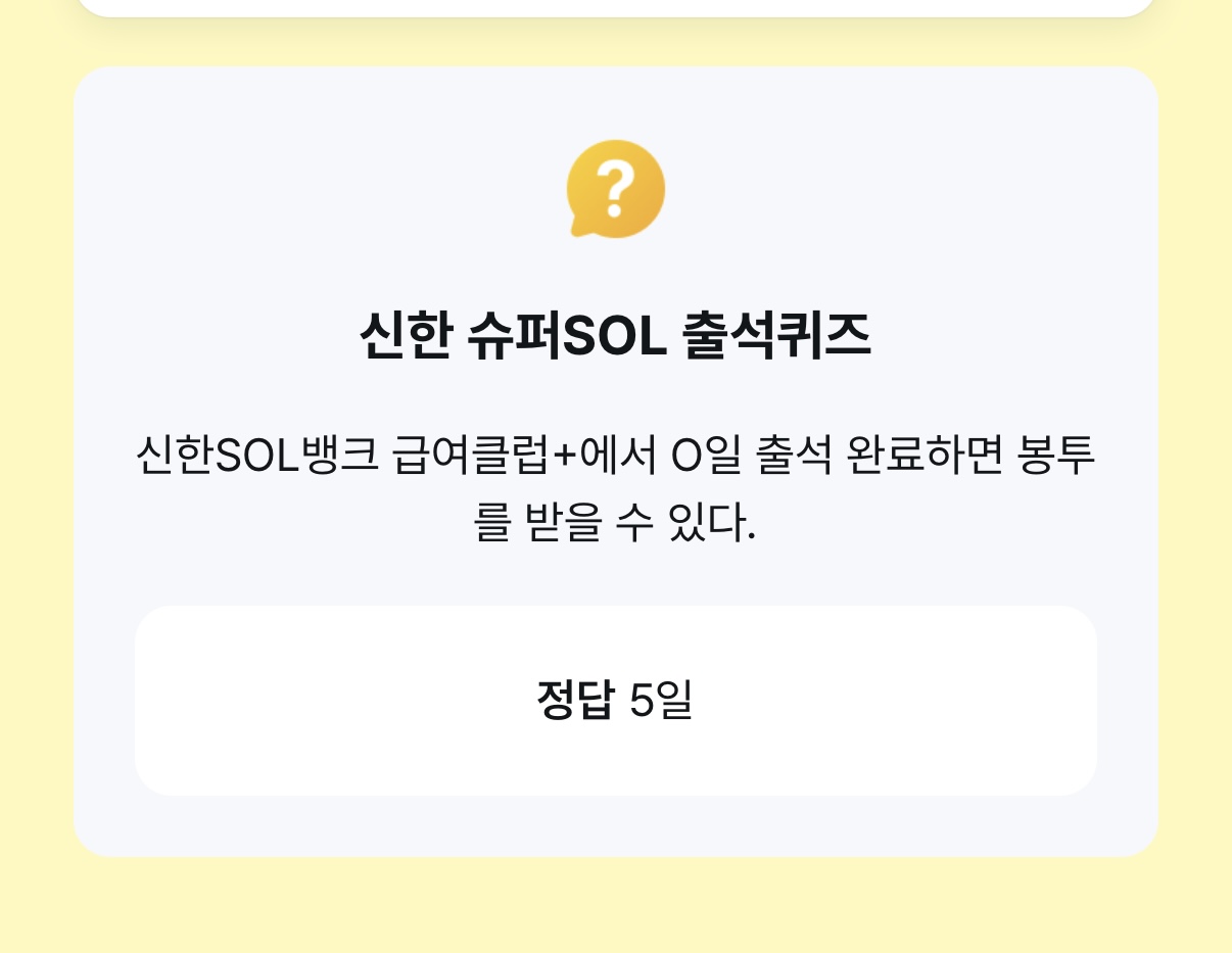 퀴즈 : 신한SOL뱅크 급여클럽+에서 0일 출석 완료하면 봉투 를 받을 수 있다.