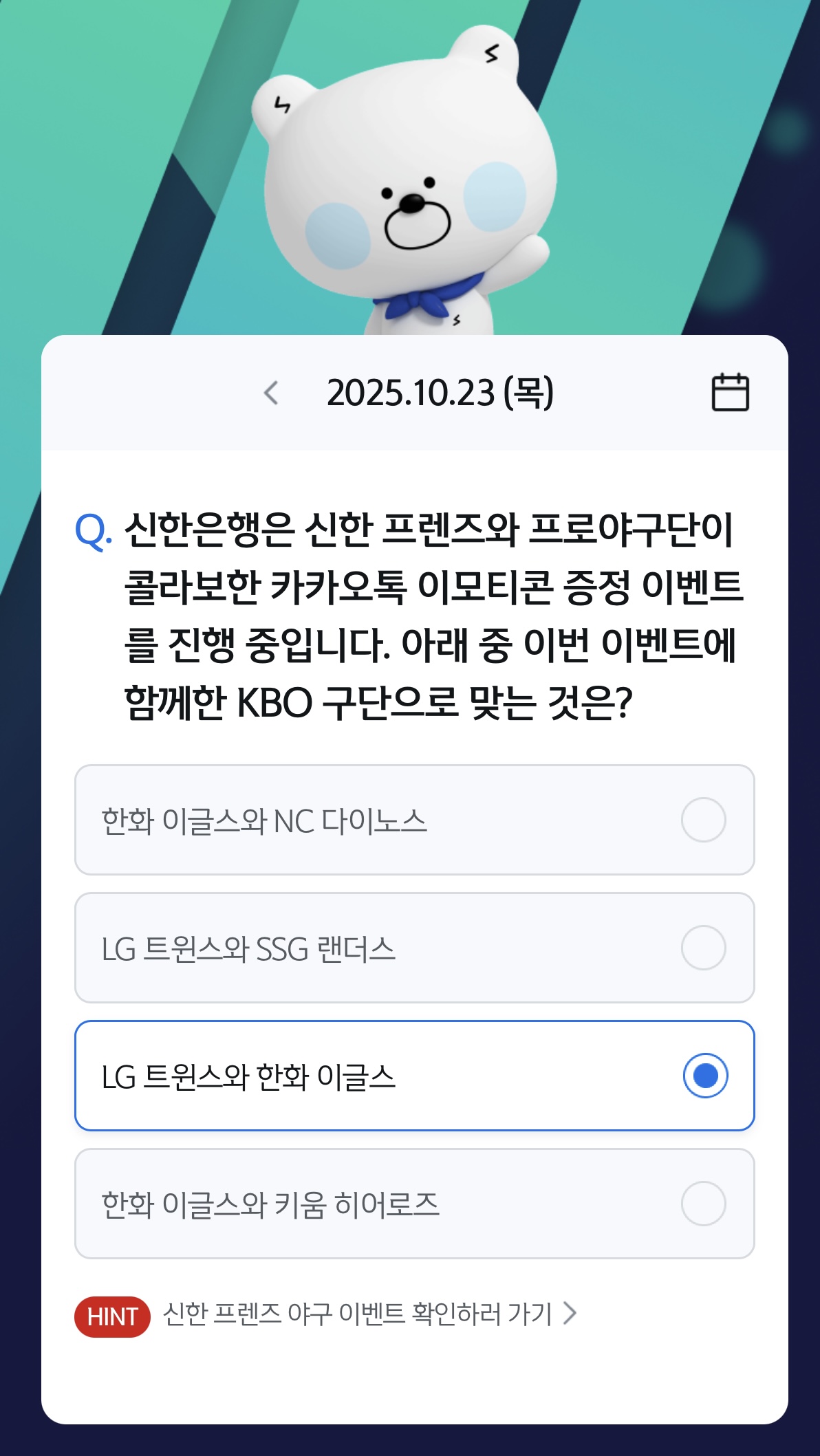 퀴즈 : 신한은행은 신한 프렌즈와 프로야구단이 콜라보한 카카오톡 이모티콘 증정 이벤트 를 진행 중입니다. 아래 중 이번 이벤트에 함께한 KBO 구단으로 맞는 것은?