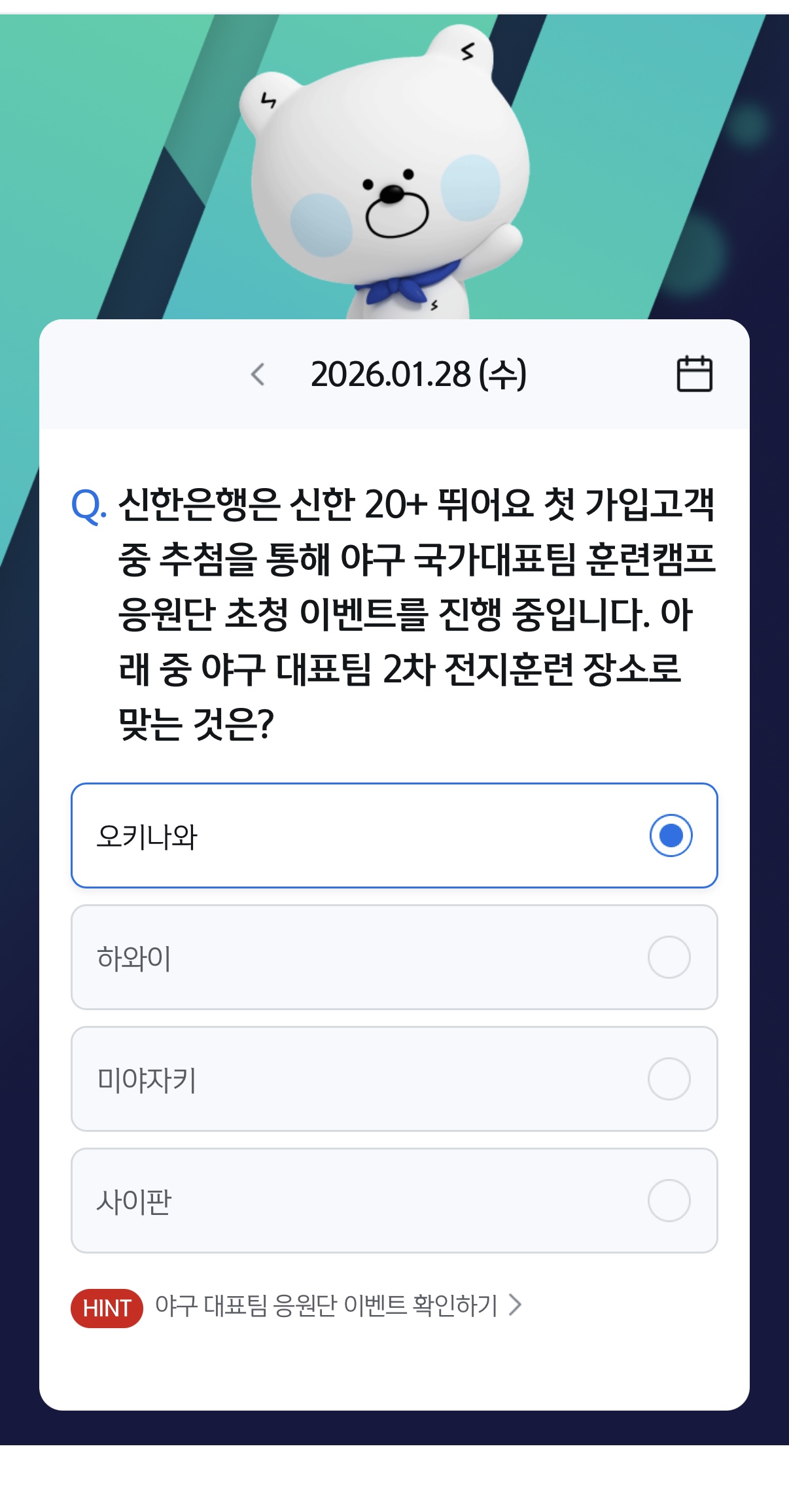 퀴즈 : 신한은행은 신한 20+ 뛰어요 첫 가입고객 중 추첨을 통해 야구 국가대표팀 훈련캠프 응원단 초청 이벤트를 진행 중입니다. 아 래 중 야구 대표팀 2차 전지훈련 장소로 맞는 것은?