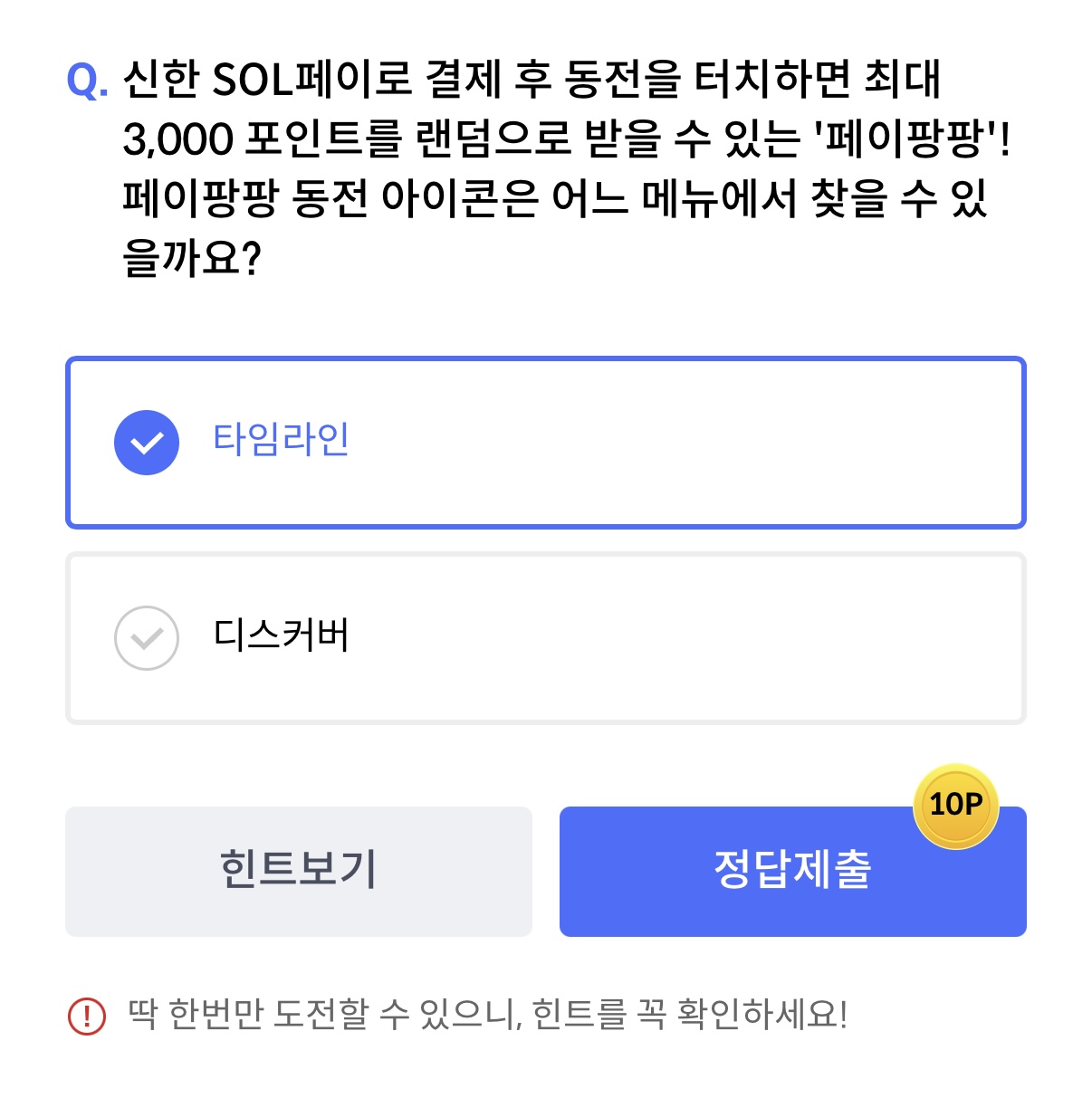 퀴즈 : 신한 SOL 페이로 결제 후 동전을 터치하면 최대 3,000 포인트를 랜덤으로 받을 수 있는 '페이팡팡!!