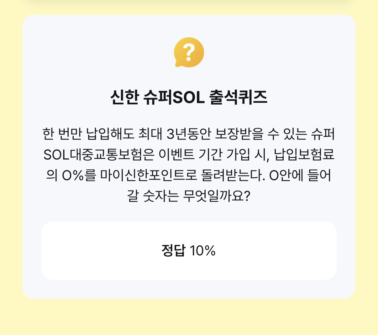 퀴즈 : 한 번만 납입해도 최대 3년동안 보장받을 수 있는 슈퍼 SOL대중교통보험은 이벤트 기간 가입 시, 납입보험료 의 0%를 마이신한포인트로 돌려받는다. 0안에 들어 갈 숫자는 무엇일까요?
