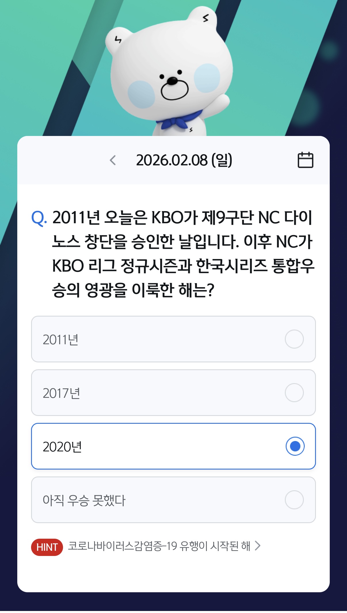 퀴즈 : 2011년 오늘은 KBO가 제9구단 NC 다이 노스 창단을 승인한 날입니다. 이후 NC가