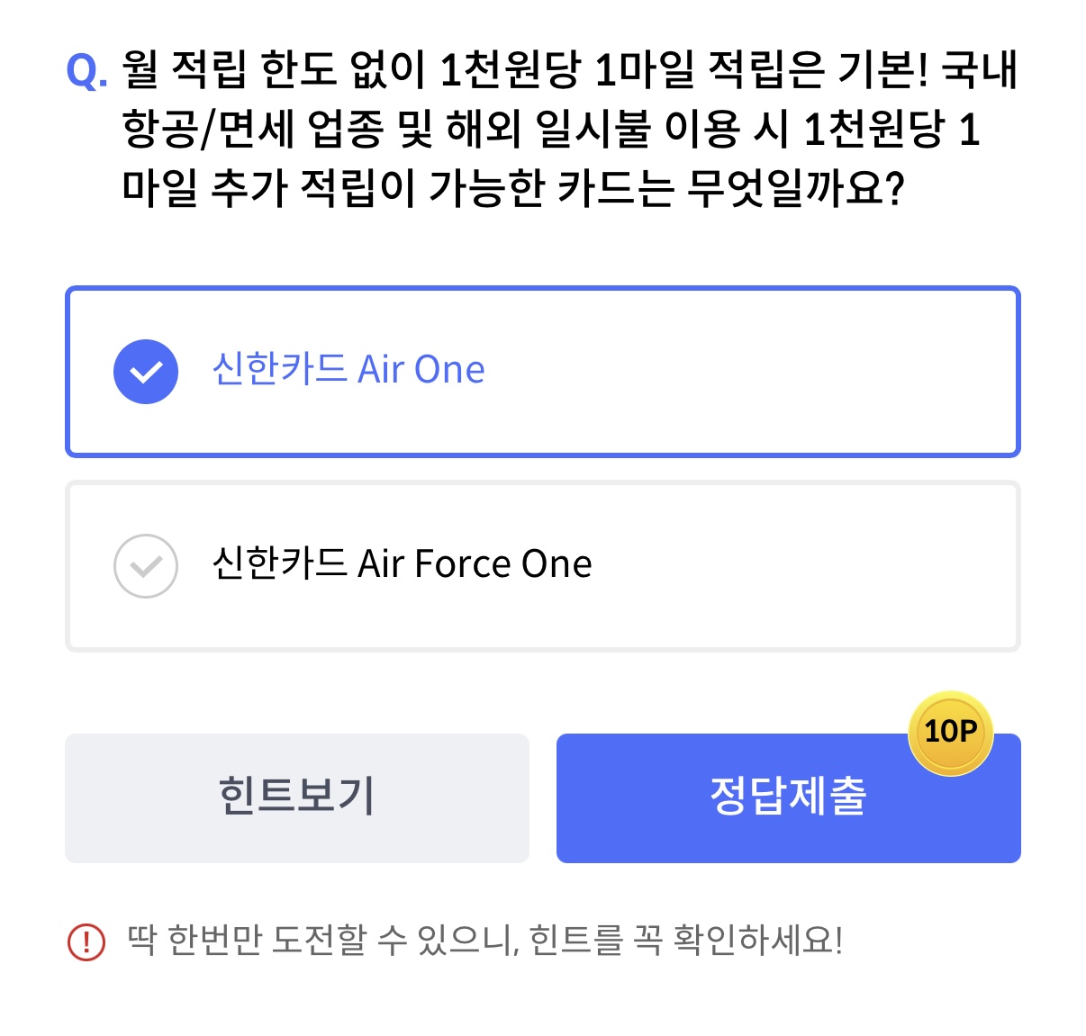 퀴즈 : 월 적립 한도 없이 1천원당 1마일 적립은 기본! 국내 항공/면세 업종 및 해외 일시불 이용 시 1천원당 1 마일 추가 적립이 가능한 카드는 무엇일까요?